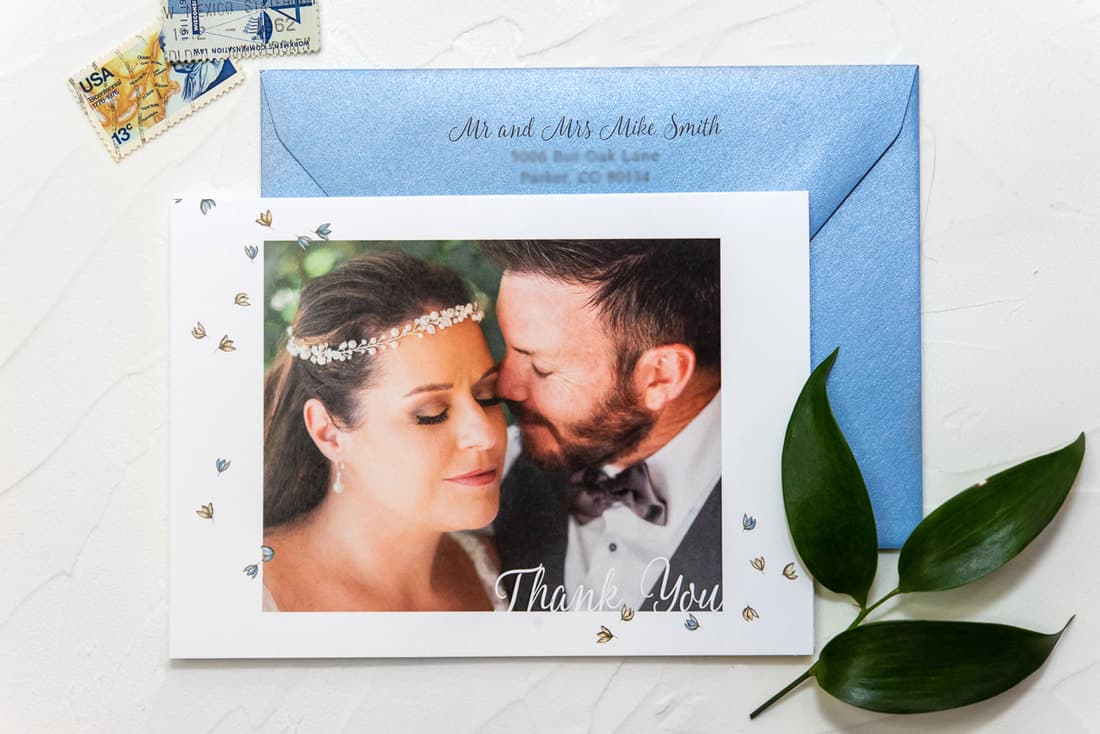 Even though you didn’t have a big fancy wedding with tons of guests, you may still receive gifts when everyone finds out you eloped. Have a handful of thank you cards created with your favorite wedding day pic on the front. Leave the back of the cards blank so you can write personalized messages.