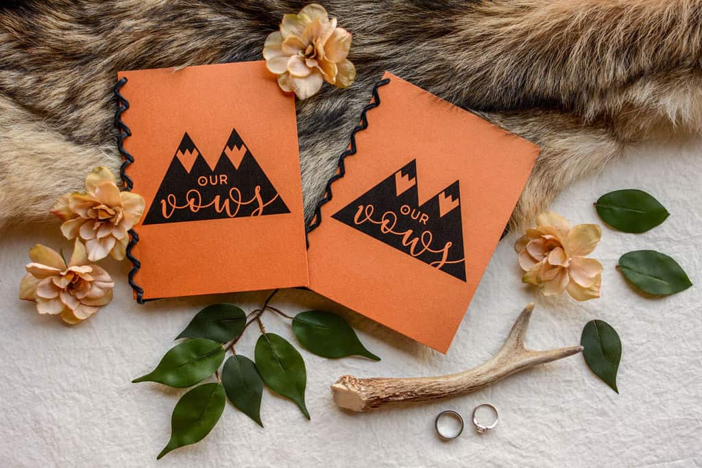 These are the absolute best keepsakes from your wedding! Visit a local stationery store to inquire about handmade notebooks for you and your partner to write your vows in. Maybe ask a calligrapher to inscribe your vows on a scroll, handkerchief, or an antique mirror; or hire a graphic artist to design and print booklets that reflect your elopement day theme.